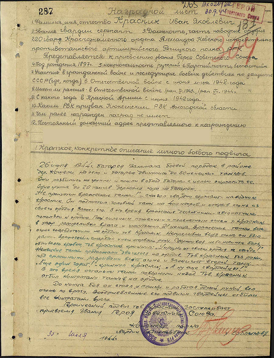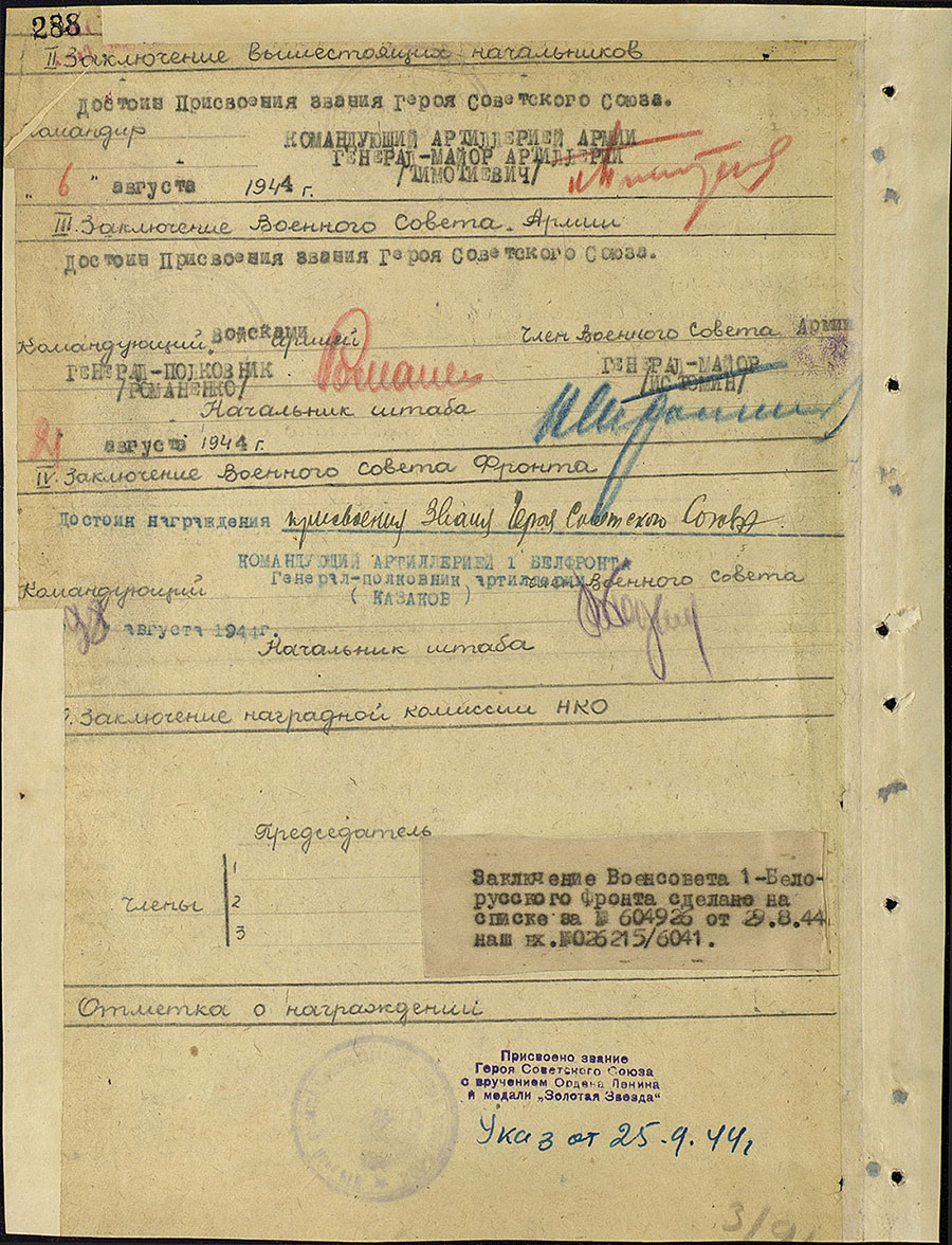 Звание Героя Советского Союза присвоено 25 сентября 1944 года