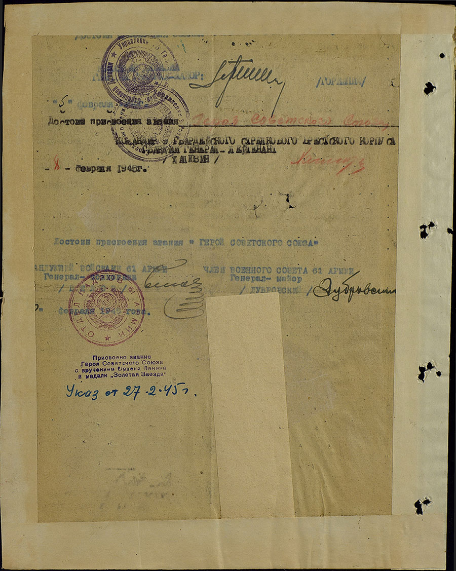 Звание Героя Советского Союза присвоено 27 февраля 1945 года