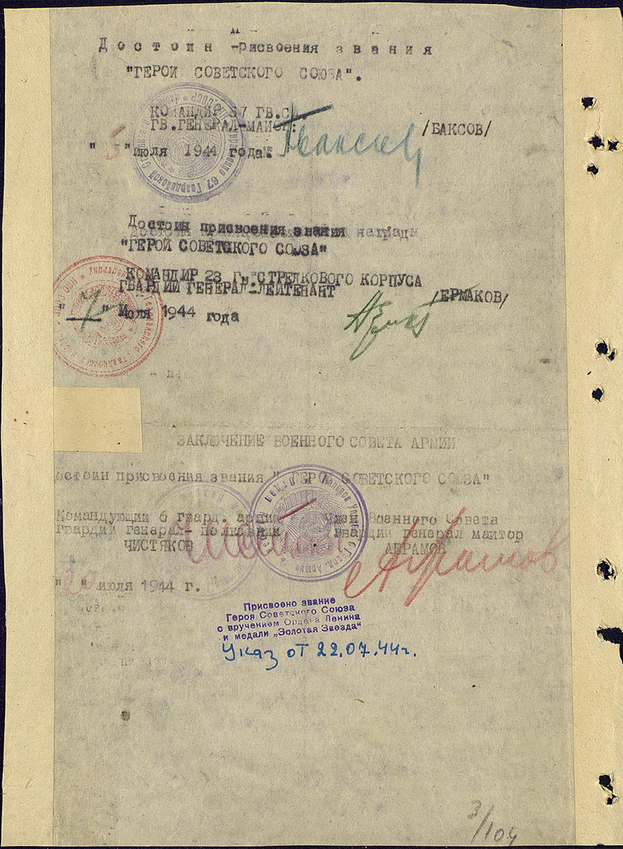 Звание Героя Советского Союза присвоено 23 июля 1944 года