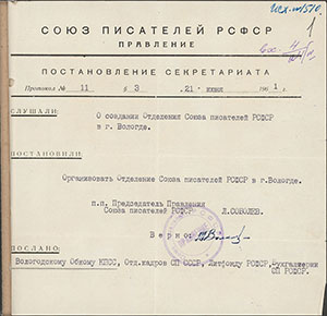 Постановление секретариата Союза писателей РСФСР о создании Отделения Союза писателей РСФСР в г. Вологде