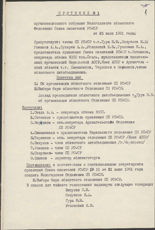 Протокол организационного собрания Вологодского областного отделения Союза писателей РСФСР от 25 июля 1961 года