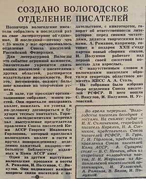 8. «Красный Север» «Рождение новой организации». 27 июля 1961 года. «Вологодский комсомолец» «Создано вологодское отделение писателей». 27 июля 1961 года.